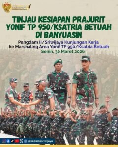 SUMATRA SELATAN, Matanews –‘Pangdam II/Sriwijaya, Mayor Jenderal TNI Ujang Darwis, M.D.A., melaksanakan kunjungan kerja ke Marshaling Area Yonif TP 950/Ksatria Betuah yang berlokasi di Kelurahan Rimba Asam, Kecamatan Betung, Kabupaten Banyuasin, Sumatera Selatan, Senin (30/03/2026).